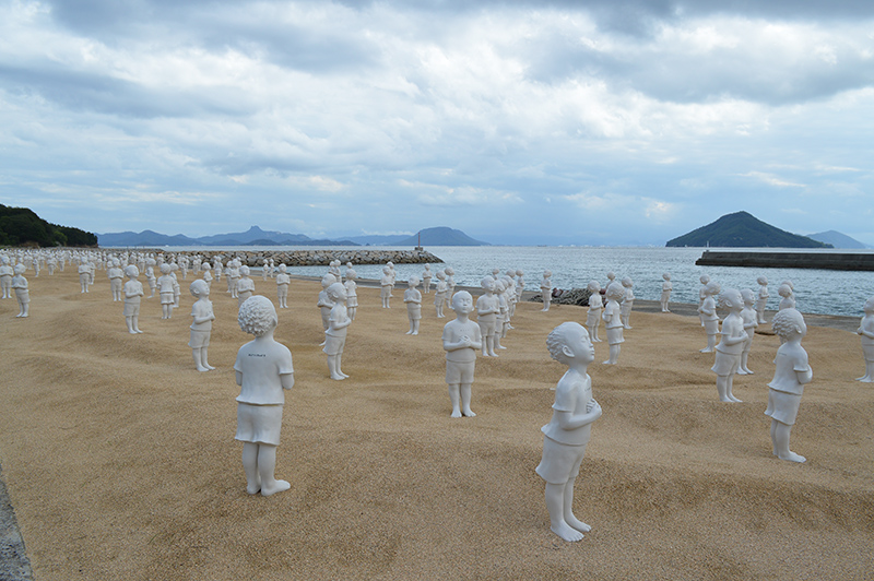 Eu visitei as ilhas pouco antes do início da Setouchi Triennale de 2025. Ainda assim, pude conferir uma das obras que já tinha sido instalada. O nome dela era ‘Beyond the Border – Prayer’, do artista taiwanês Lin Shuen Long. A obra trazia esculturas de 197 crianças, cada uma delas com a latitude da capital do um país impressa nas costas. Elas estavam voltadas em direção ao seu respectivo país, numa pose de prece. Um gesto que representa a próxima geração que reza pelo futuro dos seus países e do planeta.